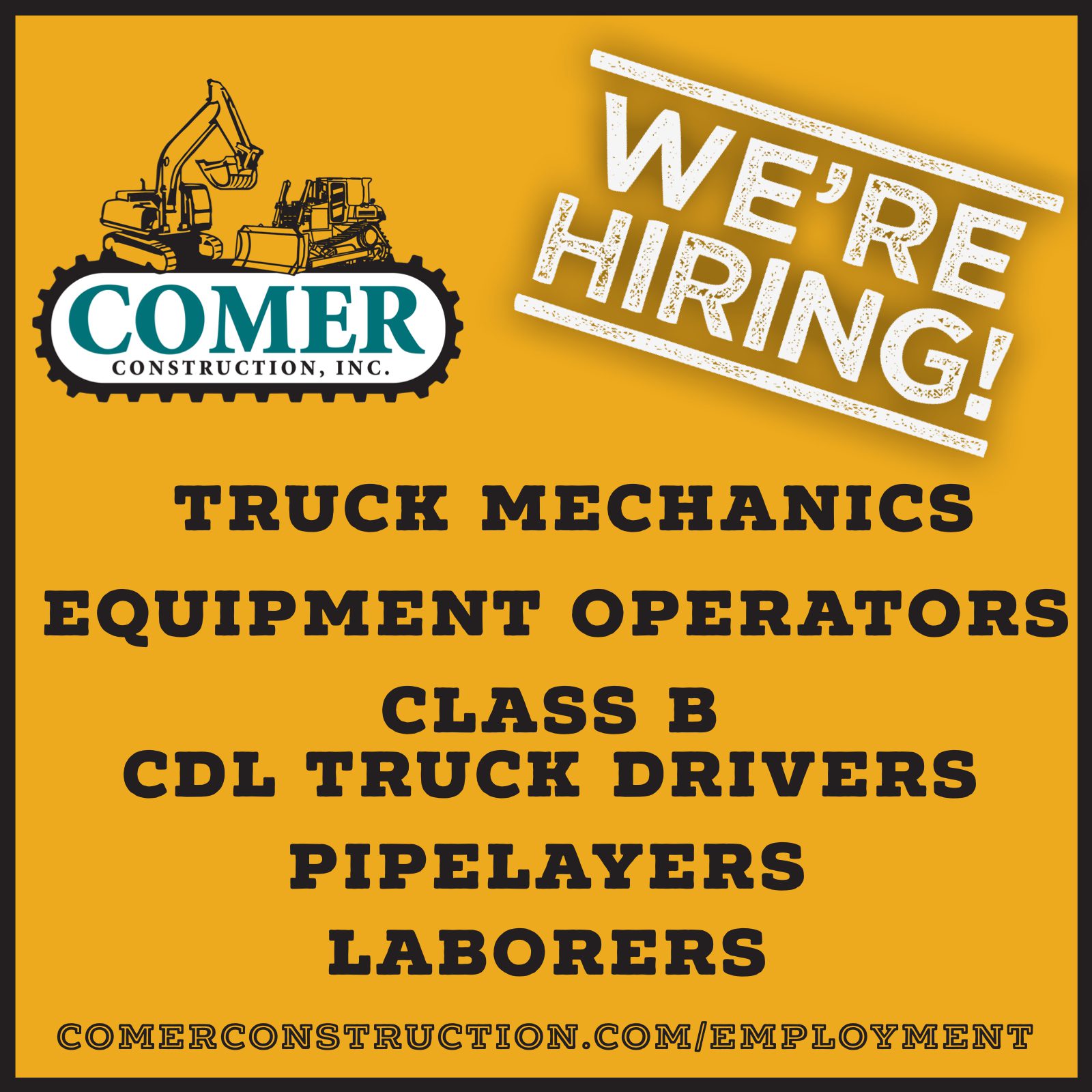 Comer Construction is actively seeking to hire experienced Truck Mechanics, Equipment Operators, Class B CDL Truck Drivers, Pipelayers and Laborers. At Comer Construction we offer competitive wages, 100% employer-paid health insurance for employees, matching 401k, and other benefit options such as dental, short- and long-term disability and life insurance. For more information about these positions and to schedule an interview, contact Dorothy Kuzora at 410-879-6094 or fill out an application at